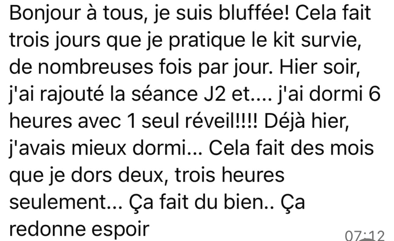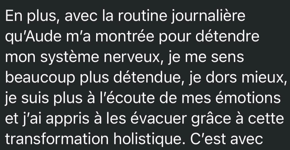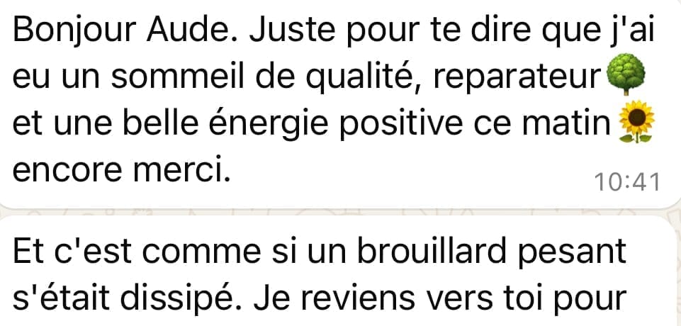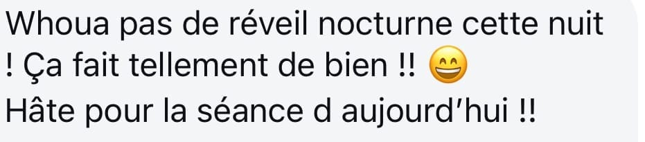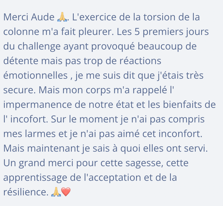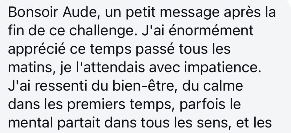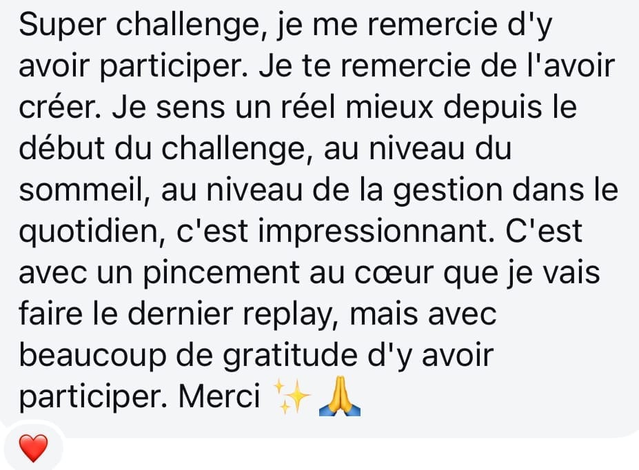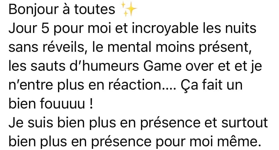 "Jour 5 et incroyable les nuits sans réveil, le mental moins présent, les sauts d'humeur game over et je n'entre plus en réaction....ça fait un bien fouuuuu! Je suis bien plus en présence et surtout bien plus en présence avec moi-même"