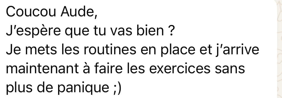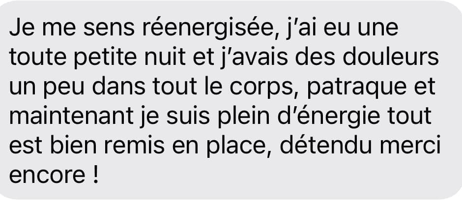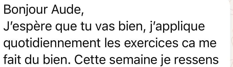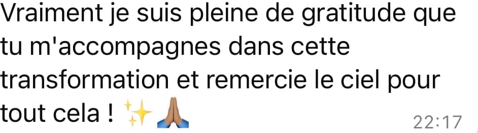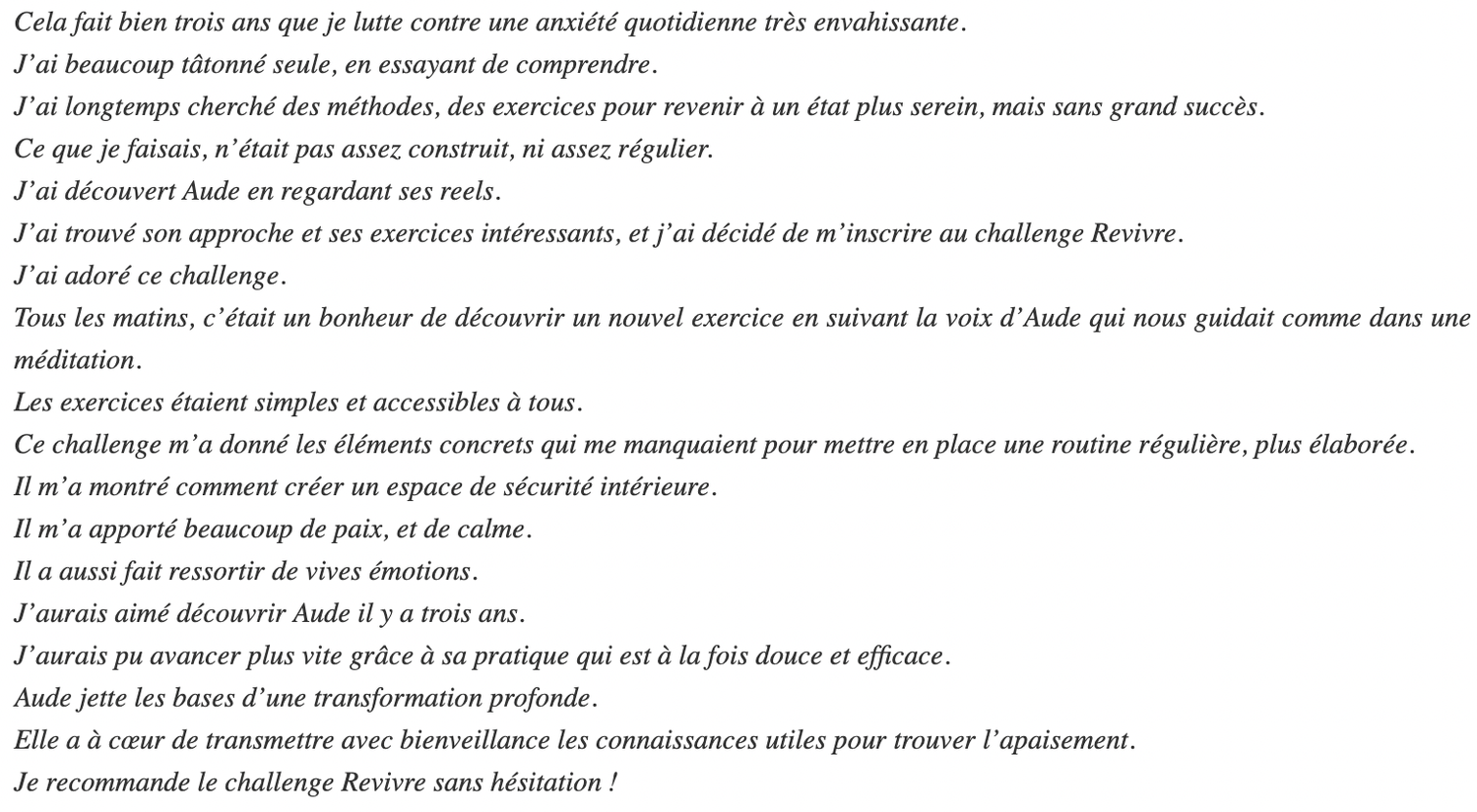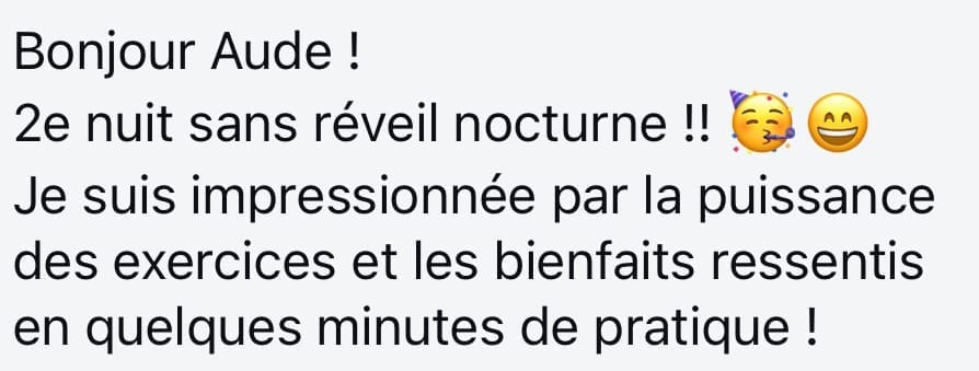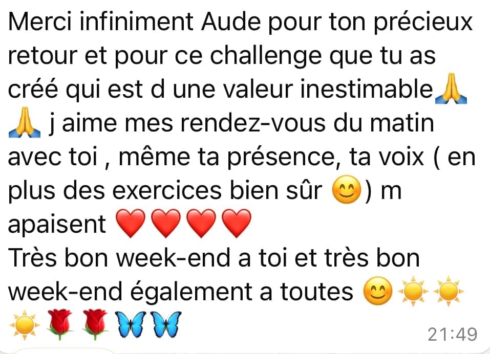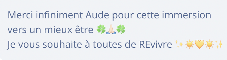 "Jour 5 et incroyable les nuits sans réveil, le mental moins présent, les sauts d'humeur game over et je n'entre plus en réaction....ça fait un bien fouuuuu! Je suis bien plus en présence et surtout bien plus en présence avec moi-même"